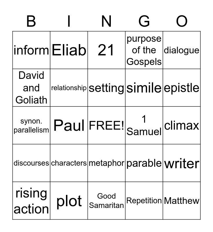 This bingo card has a free space and 24 words: characters, plot, setting, rising action, dialogue, inform, David and Goliath, Eliab, 1 Samuel, metaphor, simile, synon. parallelism, parable, writer, relationship, Repetition, climax, 21, epistle, Paul, Matthew, discourses, purpose of the Gospels and Good Samaritan.
