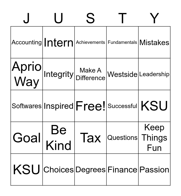 This bingo card has a free space and 29 words: KSU, Inspired, Inspired, Mom, Accounting, Achievements, Integrity, Be Kind, Successful, Choices, KSU, Passion, Degrees, Finance, Leadership, Audit, Tax, Goal, Mistakes, Softwares, Questions, Knowledge, Westside, Aprio Way, Fundamentals, Intern, Keep Things Fun, Make A Difference and Achieving Your Dreams.