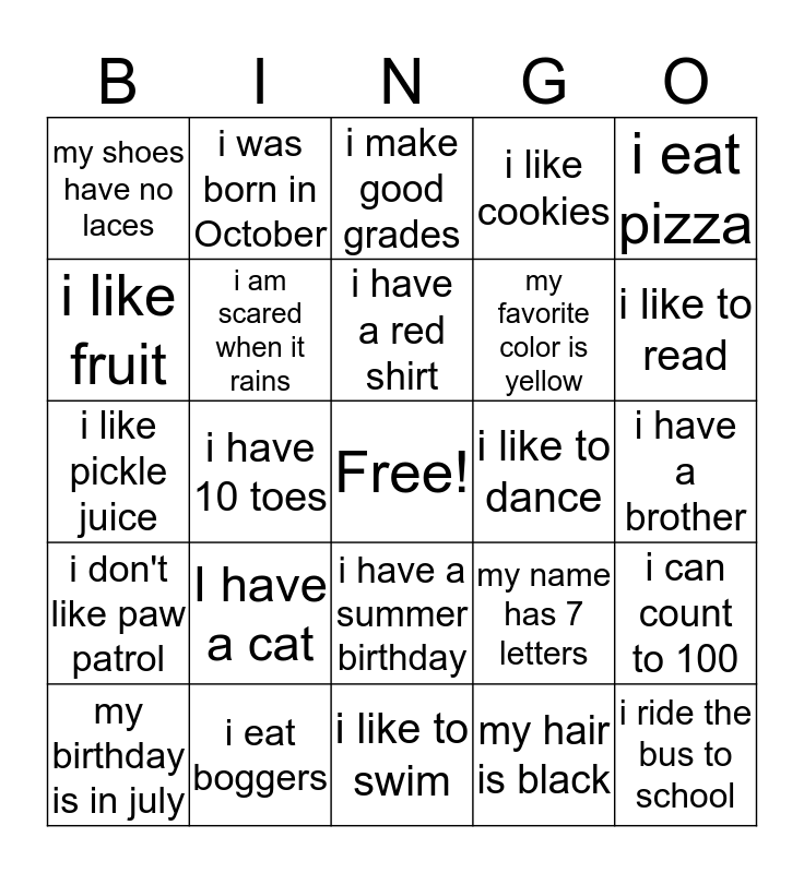 This bingo card has a free space and 24 words: I have a cat, i eat boggers, i have a red shirt, my birthday is in july, i eat pizza, my shoes have no laces, i like fruit, i was born in October, i like to dance, i have a summer birthday, my favorite color is yellow, i like pickle juice, my name has 7 letters, i can count to 100, i am scared when it rains, my hair is black, i have a brother, i make good grades, i like to read, i have 10 toes, i ride the bus to school, i don't like paw patrol, i like cookies and i like to swim.