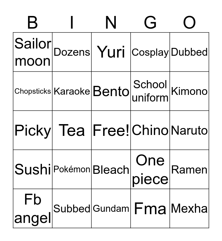 This bingo card has a free space and 24 words: Pokémon, Subbed, Bento, Fb angel, Dubbed, Sailor moon, Chopsticks, Dozens, Chino, Bleach, School uniform, Picky, One piece, Ramen, Karaoke, Fma, Naruto, Yuri, Kimono, Tea, Mexha, Sushi, Cosplay and Gundam.