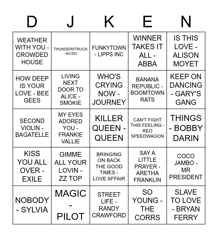 This bingo card has 50 words: YOU MAKE ME FEEL LIKE DANCING - LEO SAYER, KILLER QUEEN - QUEEN, BLACK OR WHITE - MICHAEL JACKSON, STREET LIFE - RANDY CRAWFORD, GIMME ALL YOUR LOVIN - ZZ TOP, WE ARE THE WORLD - USA 4 AFRICA, THUNDERSTRUCK - AC/DC, HOLD ON TO MY LOVE - JIMMY RUFFIN, HOW DEEP IS YOUR LOVE - BEE GEES, SUMMER IN THE CITY - LOVING SPOONFUL, LIVING NEXT DOOR TO ALICE - SMOKIE, WINNER TAKES IT ALL - ABBA, COCO JAMBO - MR PRESIDENT, SAY A LITTLE PRAYER - ARETHA FRANKLIN, COWARD OF THE COUNTY - KENNY ROGERS, MOODY BLUE - ELVIS PRESLEY, WHO'S CRYING NOW - JOURNEY, CAN'T FIGHT THIS FEELING - REO SPEEDWAGON, LOVE TO LOVE - DONNA SUMMER, IS THIS LOVE - ALISON MOYET, MY EYES ADORED YOU - FRANKIE VALLIE, SO YOUNG - THE CORRS, WEATHER WITH YOU - CROWDED HOUSE, BANANA REPUBLIC - BOOMTOWN RATS, THONG SONG - SISQUE, SLAVE TO LOVE - BRYAN FERRY, KEEP ON DANCING - GARY'S GANG, GREATEST LOVE OF ALL - WHITNEY HOUSTON, FUNKYTOWN - LIPPS INC, BRINGING ON BACK THE GOOD TIMES - LOVE AFFAIR, SEARCH FOR A HERO - M PEOPLE, TWO OUT OF THREE - MEATLOAF, SOLITAIRE - ANDY WILLIAMS, ALONE AGAIN - GILBERT O'SULLIVAN, MAGIC - PILOT, NATIVE NEW YORKER - ODYSSEY, LITTLE OLE WINE DRINKER - DEAN MARTIN, STARS - SIMPLY RED, DON'T BRING ME DOWN - ELO, THINGS - BOBBY DARIN, HOW ABOUT US - CHAMPAGNE, RHYTHM OF THE RAIN - CASUALS, HAPPY TOGETHER - TURTLES, SOMETHING INSIDE SO STRONG - LABRI SIFFEE, NOBODY - SYLVIA, SECOND VIOLIN - BAGATELLE, I WILL SURVIVE - GLORIA GAYNOR, LATELY - STEVIE WONDER, KISS YOU ALL OVER - EXILE and LIVING ON MY OWN - FREDDIE MERCURY.