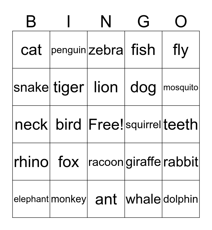 This bingo card has a free space and 24 words: fox, monkey, lion, elephant, fly, cat, snake, penguin, squirrel, racoon, dog, neck, giraffe, rabbit, tiger, whale, teeth, zebra, mosquito, bird, dolphin, rhino, fish and ant.
