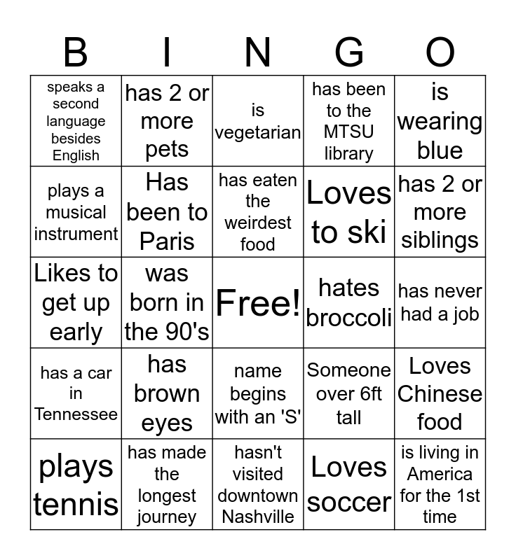 This bingo card has a free space and 24 words: has brown eyes, has made the longest journey, has eaten the weirdest food, plays tennis, is wearing blue, speaks a second language besides English, plays a musical instrument, has 2 or more pets, hates broccoli, name begins with an 'S', Loves to ski, Likes to get up early, Someone over 6ft tall, Loves Chinese food, Has been to Paris, Loves soccer, has never had a job, is vegetarian, has 2 or more siblings, was born in the 90's, is living in America for the 1st time, has a car in Tennessee, has been to the MTSU library and hasn't visited downtown Nashville.