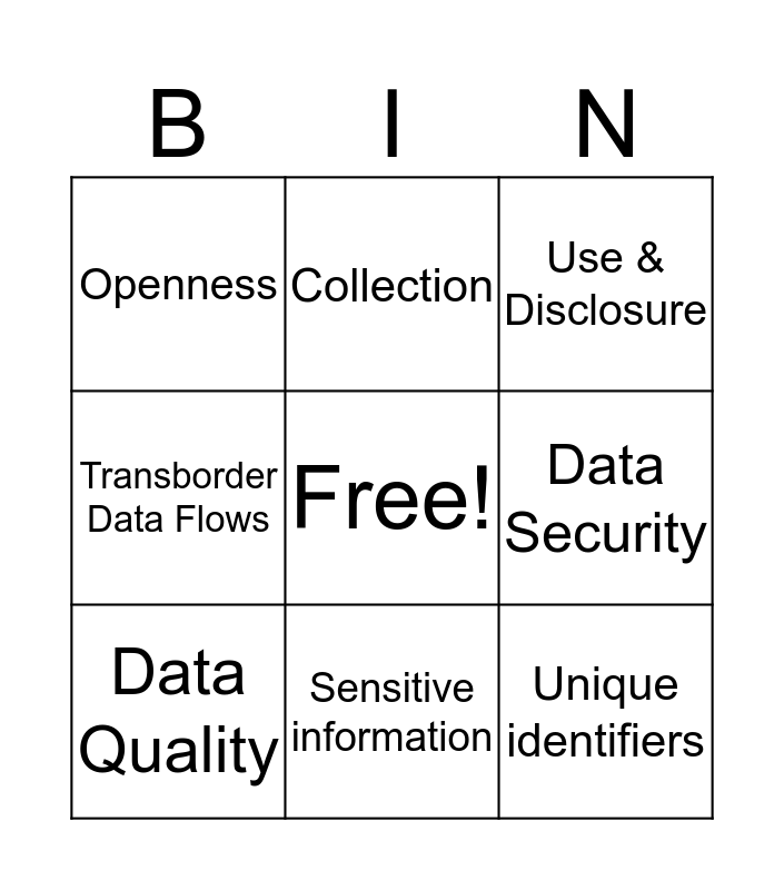 This bingo card has a free space and 8 words: Data Security, Use & Disclosure, Collection, Data Quality, Openness, Unique identifiers, Transborder Data Flows and Sensitive information.