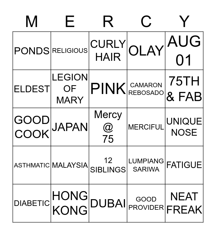 This bingo card has a free space and 34 words: 3 KIDS, THRIFTY, SINGA PORE, SENIOR MOMENT, UNIQUE NOSE, ELDEST, LEGION OF MARY, DUBAI, CAMARON REBOSADO, NEAT FREAK, GOOD COOK, RELIGIOUS, GOOD PROVIDER, HIP SURGERY, ASTHMATIC, JAPAN, 12 SIBLINGS, MERCIFUL, FATIGUE, DIABETIC, HONG KONG, LECHE FLAN, OLAY, 75TH & FAB, DepED, MALAYSIA, CURLY HAIR, KIKAY KIT, AUG 01, PONDS, 5'1", PINK, LUMPIANG SARIWA and FRUIT SALAD.
