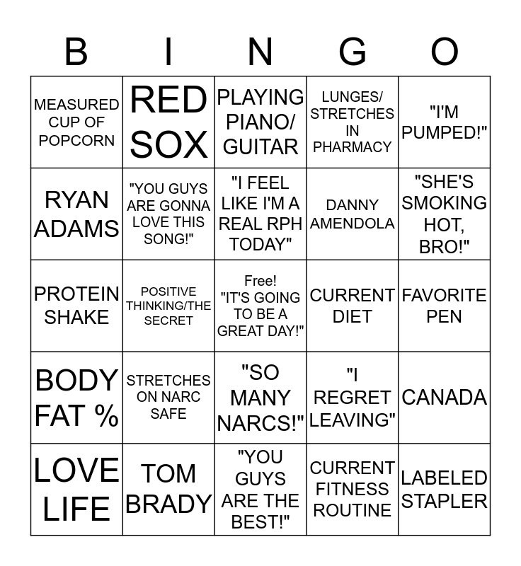 This bingo card has a free space and 24 words: STRETCHES ON NARC SAFE, TOM BRADY, "I FEEL LIKE I'M A REAL RPH TODAY", LOVE LIFE, "I'M PUMPED!", MEASURED CUP OF POPCORN, RYAN ADAMS, RED SOX, CURRENT DIET, "SO MANY NARCS!", DANNY AMENDOLA, PROTEIN SHAKE, "I REGRET LEAVING", CANADA, "YOU GUYS ARE GONNA LOVE THIS SONG!", CURRENT FITNESS ROUTINE, FAVORITE PEN, PLAYING PIANO/ GUITAR, "SHE'S SMOKING HOT, BRO!", POSITIVE THINKING/THE SECRET, LABELED STAPLER, BODY FAT %, LUNGES/ STRETCHES IN PHARMACY and "YOU GUYS ARE THE BEST!".