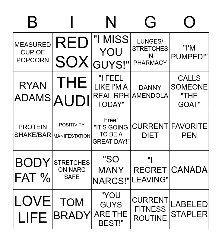 This bingo card has a free space and 24 words: STRETCHES ON NARC SAFE, TOM BRADY, "I FEEL LIKE I'M A REAL RPH TODAY", LOVE LIFE, "I'M PUMPED!", MEASURED CUP OF POPCORN, RYAN ADAMS, RED SOX, CURRENT DIET, "SO MANY NARCS!", DANNY AMENDOLA, PROTEIN SHAKE/BAR, "I REGRET LEAVING", CANADA, THE AUDI, CURRENT FITNESS ROUTINE, FAVORITE PEN, "I MISS YOU GUYS!", CALLS SOMEONE "THE GOAT", POSITIVITY = MANIFESTATION, LABELED STAPLER, BODY FAT %, LUNGES/ STRETCHES IN PHARMACY and "YOU GUYS ARE THE BEST!".