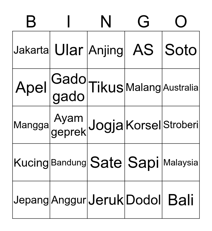 This bingo card has 25 words: Bandung, Jeruk, Tikus, Jepang, Soto, Jakarta, Apel, Ular, Korsel, Sate, Malang, Mangga, Sapi, Malaysia, Gado gado, Bali, Stroberi, Anjing, Australia, Ayam geprek, Jogja, Anggur, Kucing, AS and Dodol.