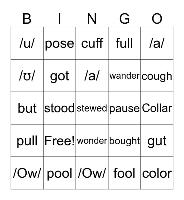 This bingo card has 25 words: Free!, /Ow/, /a/, /Ow/, /a/, /u/, /ʊ/, pose, pause, wonder, wander, but, bought, gut, got, color, Collar, cuff, cough, stood, stewed, pool, pull, full and fool.