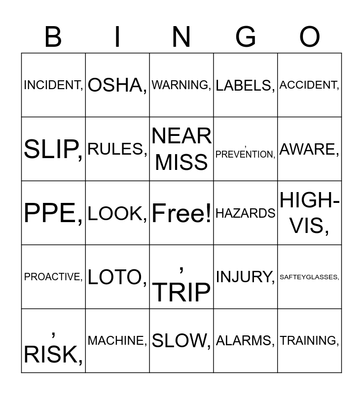 This bingo card has a free space and 24 words: LOTO,, MACHINE,, NEAR MISS, , RISK,, ACCIDENT,, INCIDENT,, SLIP,, OSHA,, HAZARDS, , TRIP, , PREVENTION,, PPE,, INJURY,, SAFTEYGLASSES,, RULES,, ALARMS,, HIGH-VIS,, WARNING,, AWARE,, LOOK,, TRAINING,, PROACTIVE,, LABELS, and SLOW,.