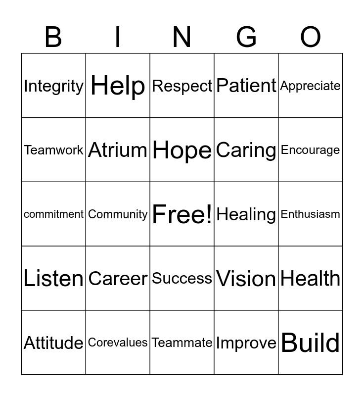 This bingo card has a free space and 24 words: Career, Corevalues, Hope, Attitude, Appreciate, Integrity, Teamwork, Help, Healing, Success, Caring, commitment, Vision, Health, Atrium, Improve, Enthusiasm, Respect, Encourage, Community, Build, Listen, Patient and Teammate.
