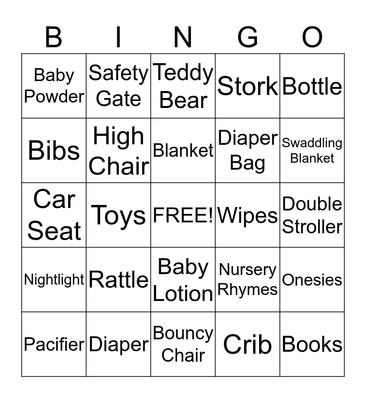 This bingo card has a free space and 24 words: Rattle, Diaper, Blanket, Pacifier, Bottle, Baby Powder, Bibs, Safety Gate, Wipes, Baby Lotion, Diaper Bag, Car Seat, Nursery Rhymes, Onesies, High Chair, Crib, Double Stroller, Teddy Bear, Swaddling Blanket, Toys, Books, Nightlight, Stork and Bouncy Chair.