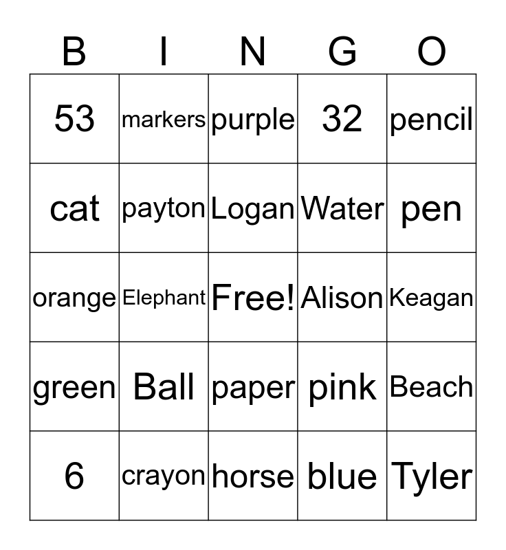 This bingo card has a free space and 24 words: Ball, crayon, Logan, 6, pencil, 53, cat, markers, Alison, paper, Water, orange, pink, Beach, payton, blue, Keagan, purple, pen, Elephant, Tyler, green, 32 and horse.