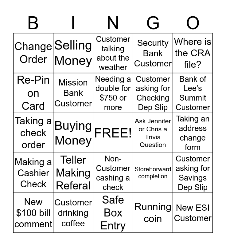 This bingo card has a free space and 24 words: Teller Making Referal, Customer drinking coffee, Needing a double for $750 or more, New $100 bill comment, Where is the CRA file?, Change Order, Re-Pin on Card, Selling Money, Ask Jennifer or Chris a Trivia Question, Non-Customer cashing a check, Customer asking for Checking Dep Slip, Taking a check order, StoreForward completion, Customer asking for Savings Dep Slip, Mission Bank Customer, Running coin, Taking an address change form, Customer talking about the weather, Bank of Lee's Summit Customer, Buying Money, New ESI Customer, Making a Cashier Check, Security Bank Customer and Safe Box Entry.