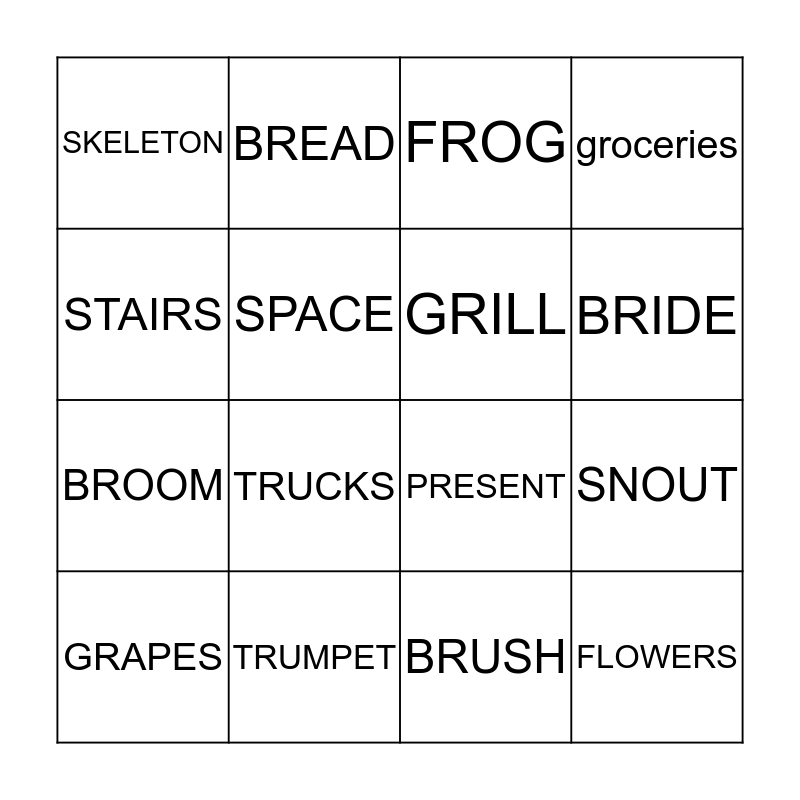 This bingo card has 16 words: TRUMPET, SNOUT, FROG, SKELETON, BROOM, BREAD, PRESENT, BRUSH, STAIRS, SPACE, GRAPES, groceries, TRUCKS, BRIDE, GRILL and FLOWERS.