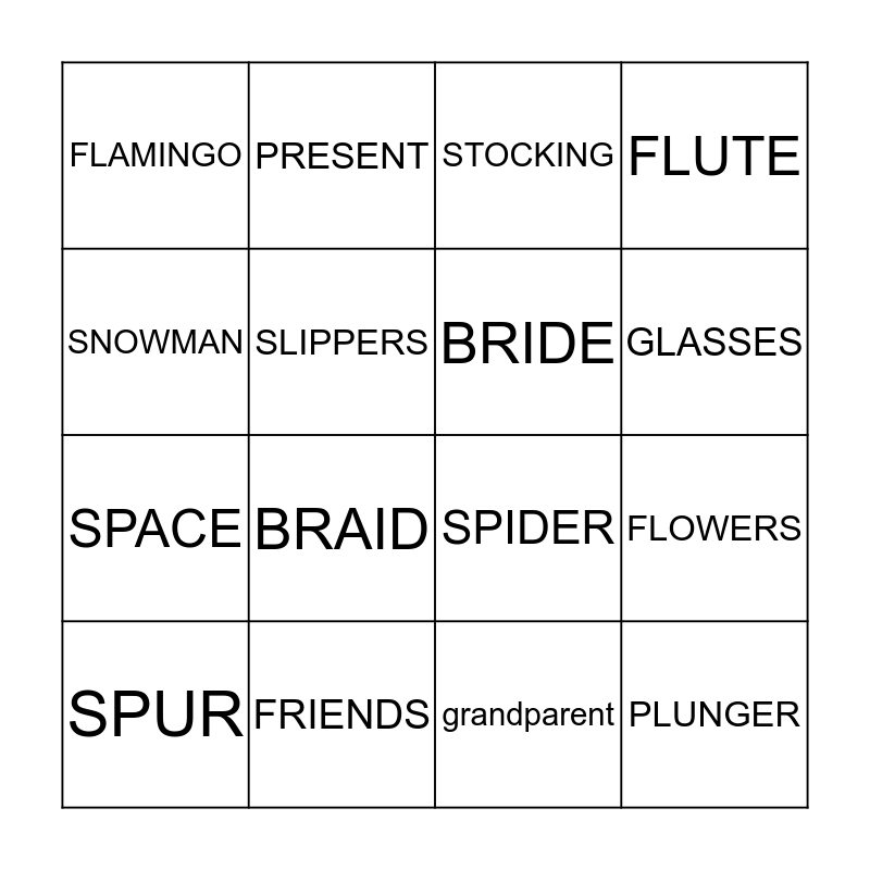 This bingo card has 16 words: FRIENDS, FLOWERS, STOCKING, FLAMINGO, SPACE, PRESENT, SPIDER, grandparent, SNOWMAN, SLIPPERS, SPUR, FLUTE, BRAID, GLASSES, BRIDE and PLUNGER.