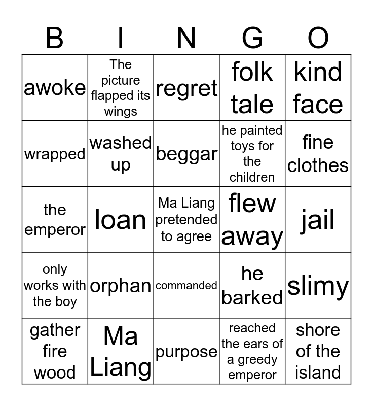 This bingo card has a free space and 24 words: orphan, Ma Liang, beggar, gather fire wood, kind face, awoke, wrapped, The picture flapped its wings, flew away, commanded, he painted toys for the children, the emperor, he barked, slimy, washed up, reached the ears of a greedy emperor, jail, regret, fine clothes, loan, shore of the island, only works with the boy, folk tale and purpose.