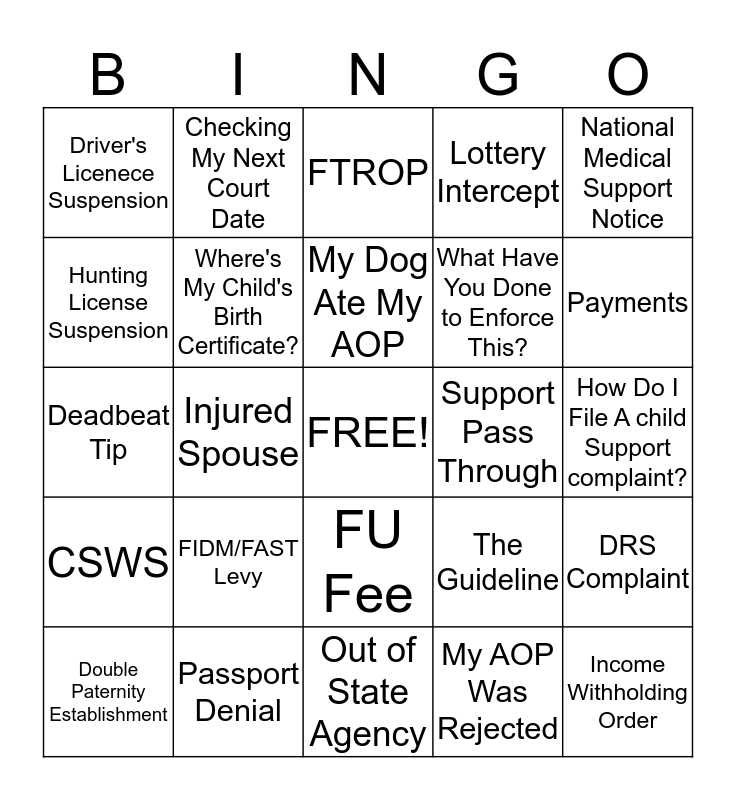 This bingo card has a free space and 24 words: FIDM/FAST Levy, Passport Denial, My Dog Ate My AOP, Double Paternity Establishment, National Medical Support Notice, Driver's Licenece Suspension, Hunting License Suspension, Checking My Next Court Date, Support Pass Through, FU Fee, What Have You Done to Enforce This?, Deadbeat Tip, The Guideline, DRS Complaint, Where's My Child's Birth Certificate?, My AOP Was Rejected, How Do I File A child Support complaint?, FTROP, Payments, Injured Spouse, Income Withholding Order, CSWS, Lottery Intercept and Out of State Agency.