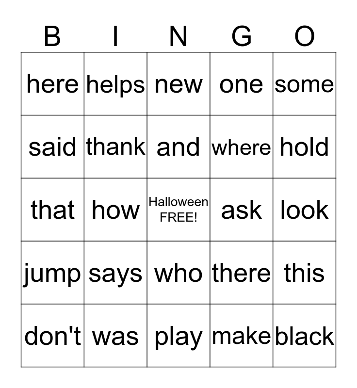 This bingo card has a free space and 24 words: says, was, and, don't, some, here, said, helps, ask, who, where, that, there, this, thank, make, look, new, hold, how, black, jump, one and play.