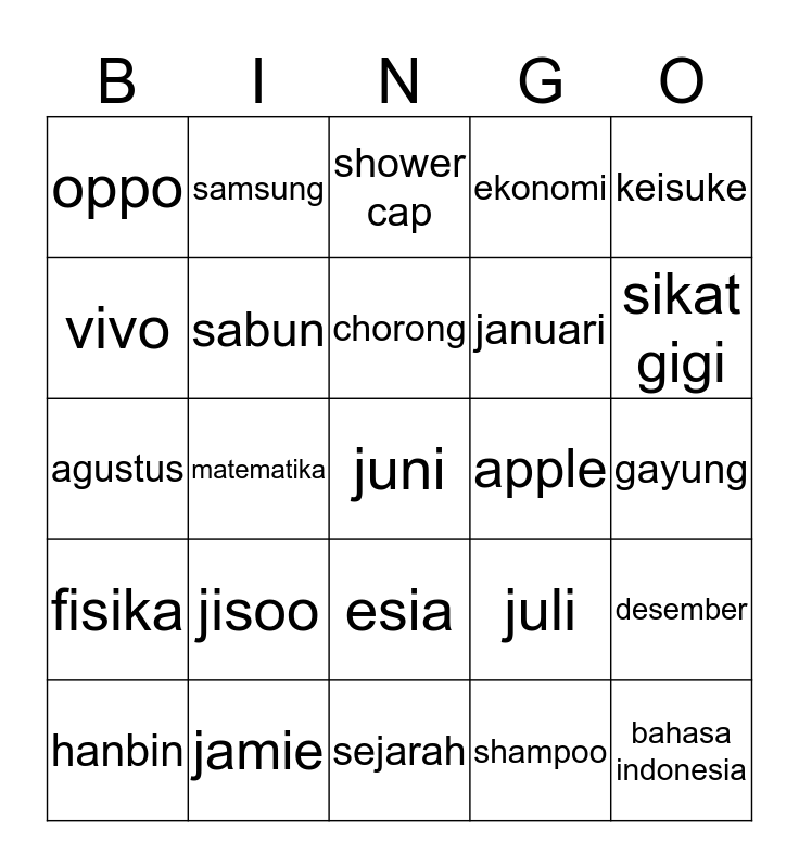 This bingo card has a free space and 24 words: jisoo, jamie, chorong, hanbin, keisuke, oppo, vivo, samsung, apple, esia, januari, agustus, juli, desember, sabun, shampoo, gayung, shower cap, sikat gigi, matematika, bahasa indonesia, fisika, ekonomi and sejarah.