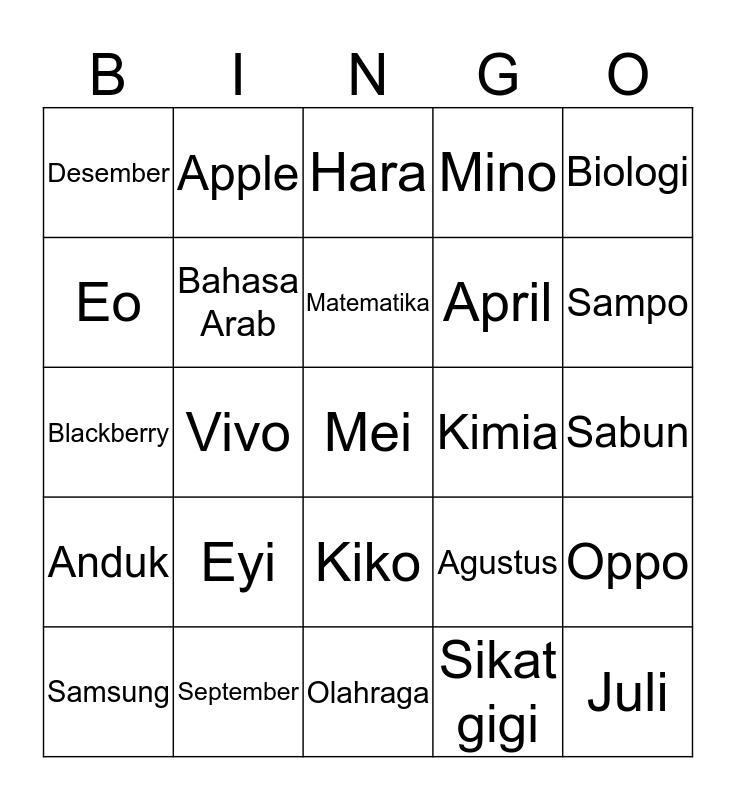 This bingo card has 25 words: Eyi, Olahraga, Matematika, Samsung, Biologi, Desember, Eo, Apple, Kimia, Kiko, April, Blackberry, Agustus, Oppo, Bahasa Arab, Juli, Sabun, Hara, Sampo, Vivo, Mei, September, Anduk, Mino and Sikat gigi.