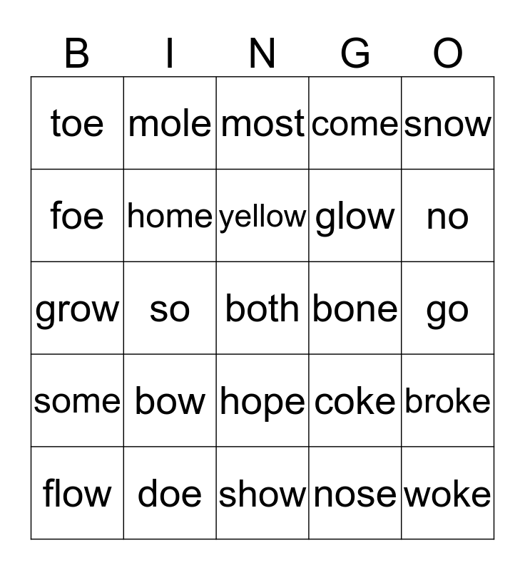 This bingo card has 25 words: bow, show, yellow, flow, snow, toe, foe, mole, bone, hope, glow, grow, coke, broke, home, woke, go, most, no, so, both, doe, some, come and nose.