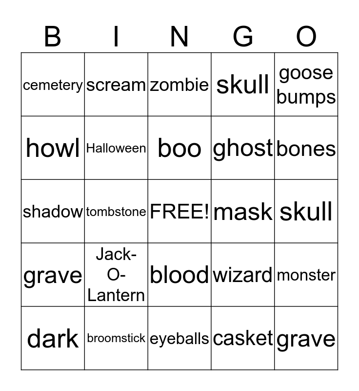 This bingo card has a free space and 39 words: haunted house, trick, treat, Halloween, dark, blood, boo, magic, goose bumps, grave, tombstone, skull, grave, skull, mask, Jack-O-Lantern, bat, cemetery, werewolf, wizard, howl, eyeballs, ghost, bones, cauldron, demon, mummy, pumpkin, scary, scream, spell, spider, zombie, broomstick, casket, goblin, monster, shadow and vampire.