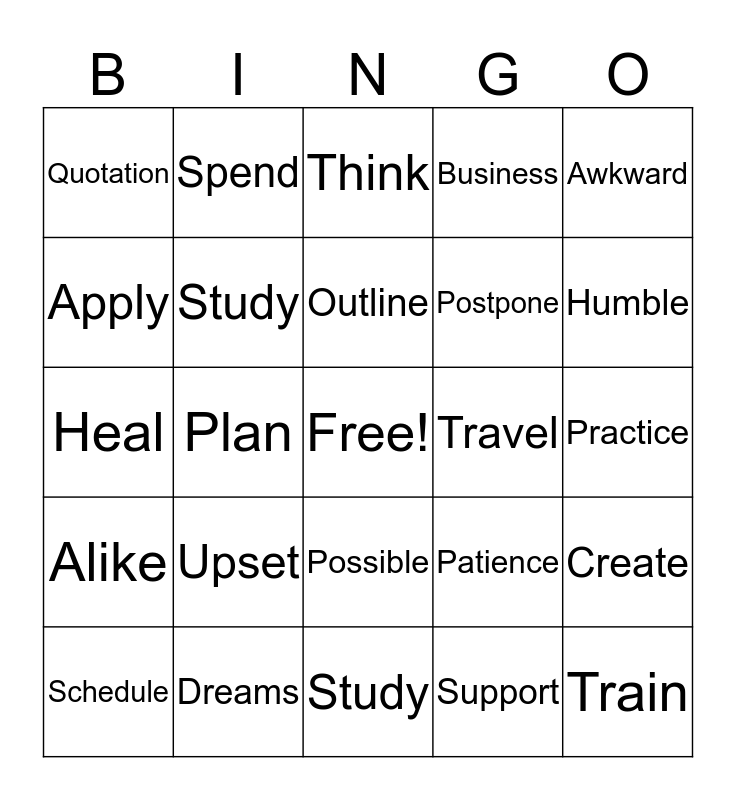 This bingo card has a free space and 30 words: Dreams, Achieve, Plan, Work, Quotation, Think, Study, Possible, Travel, Study, Practice, Train, Support, Try, Humble, Scape, Patience, Alike, Upset, Awkward, Heal, Time, Spend, Postpone, Apply, Business, Create, Schedule, Outline and Treasure.
