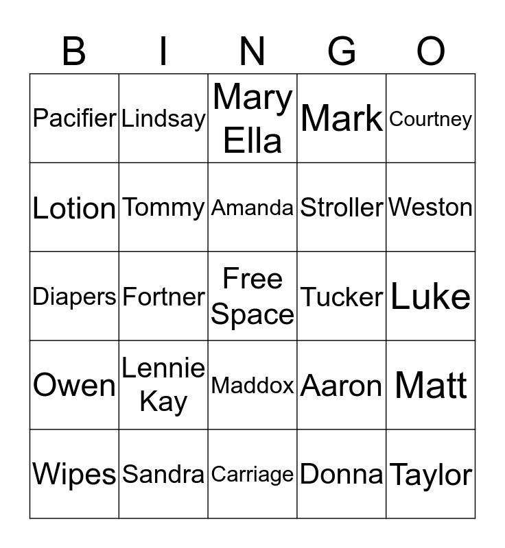 This bingo card has a free space and 24 words: Lennie Kay, Sandra, Amanda, Wipes, Courtney, Pacifier, Lotion, Lindsay, Tucker, Maddox, Stroller, Diapers, Aaron, Matt, Tommy, Donna, Luke, Mary Ella, Weston, Fortner, Taylor, Owen, Mark and Carriage.