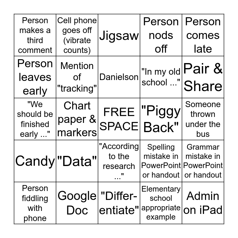 This bingo card has a free space and 24 words: "Data", Google Doc, Danielson, Person fiddling with phone, Person comes late, Person makes a third comment, Person leaves early, Cell phone goes off (vibrate counts), "Piggy Back", "According to the research ...", "In my old school ...", "We should be finished early ...", Spelling mistake in PowerPoint or handout, Grammar mistake in PowerPoint or handout, Mention of "tracking", Elementary school appropriate example, Someone thrown under the bus, Jigsaw, Pair & Share, Chart paper & markers, Admin on iPad, Candy, Person nods off and "Differ-entiate".