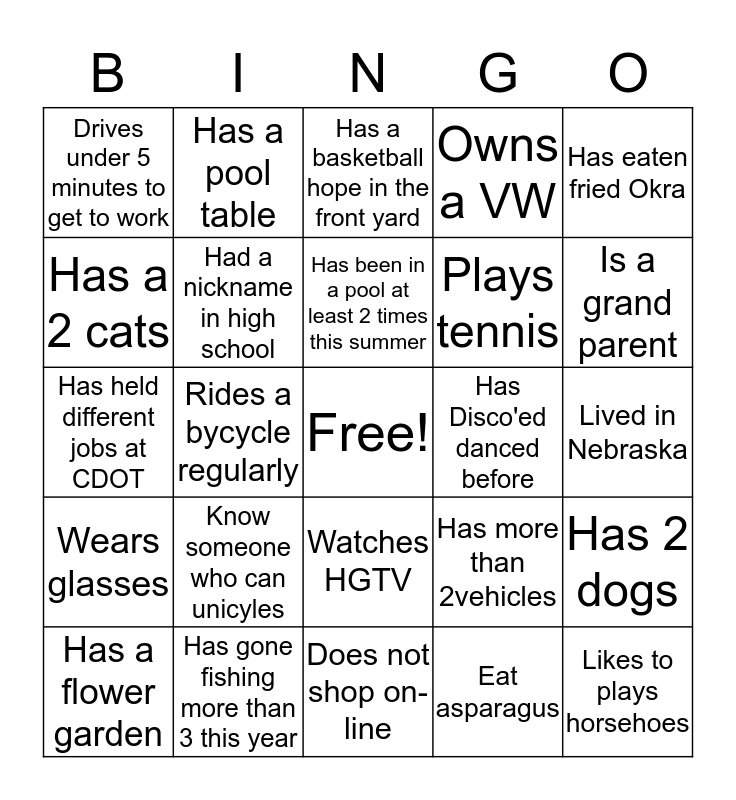 This bingo card has a free space and 24 words: Has a flower garden, Know someone who can unicyles, Has been in a pool at least 2 times this summer, Eat asparagus, Has eaten fried Okra, Drives under 5 minutes to get to work, Has a pool table, Has a basketball hope in the front yard, Has Disco'ed danced before, Lived in Nebraska, Has held different jobs at CDOT, Had a nickname in high school, Has more than 2vehicles, Has 2 dogs, Has a 2 cats, Has gone fishing more than 3 this year, Does not shop on-line, Owns a VW, Is a grand parent, Wears glasses, Rides a bycycle regularly, Watches HGTV, Plays tennis and Likes to plays horsehoes.