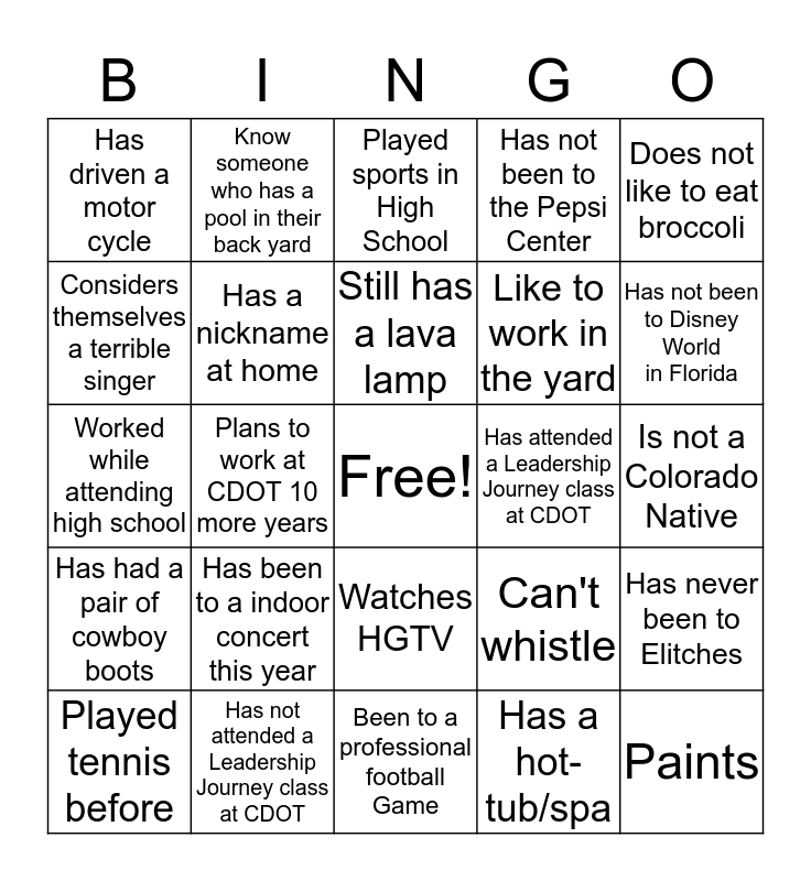 This bingo card has a free space and 24 words: Played tennis before, Has been to a indoor concert this year, Still has a lava lamp, Has a hot-tub/spa, Does not like to eat broccoli, Has driven a motor cycle, Know someone who has a pool in their back yard, Played sports in High School, Has attended a Leadership Journey class at CDOT, Is not a Colorado Native, Worked while attending high school, Has a nickname at home, Can't whistle, Has never been to Elitches, Considers themselves a terrible singer, Has not attended a Leadership Journey class at CDOT, Been to a professional football Game, Has not been to the Pepsi Center, Has not been to Disney World in Florida, Has had a pair of cowboy boots, Plans to work at CDOT 10 more years, Watches HGTV, Like to work in the yard and Paints.