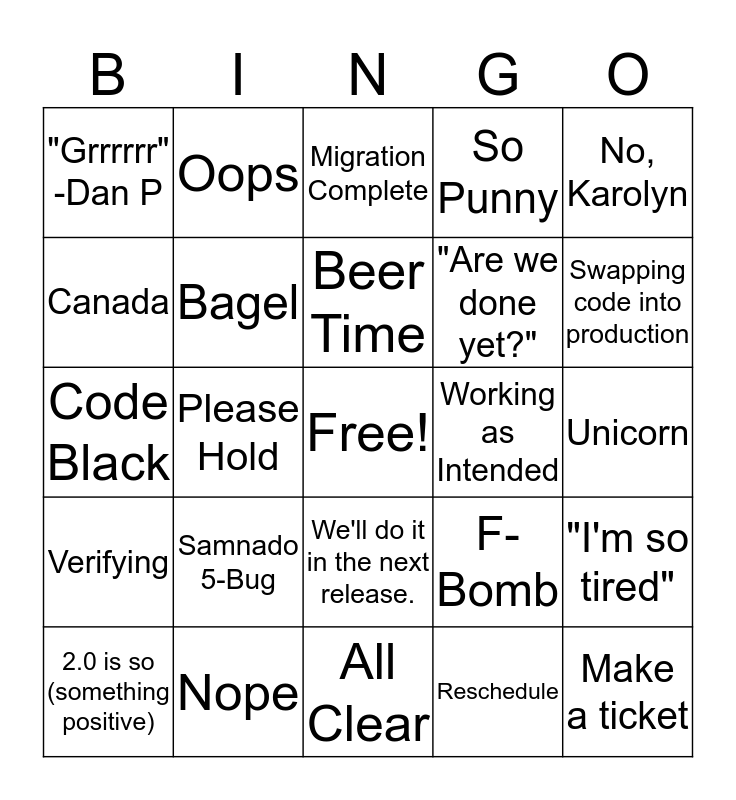 This bingo card has a free space and 24 words: Samnado 5-Bug, Nope, Beer Time, 2.0 is so (something positive), No, Karolyn, "Grrrrrr" -Dan P, Canada, Oops, Working as Intended, We'll do it in the next release., "Are we done yet?", Code Black, F-Bomb, "I'm so tired", Bagel, Reschedule, Unicorn, Migration Complete, Swapping code into production, Please Hold, Make a ticket, Verifying, So Punny and All Clear.