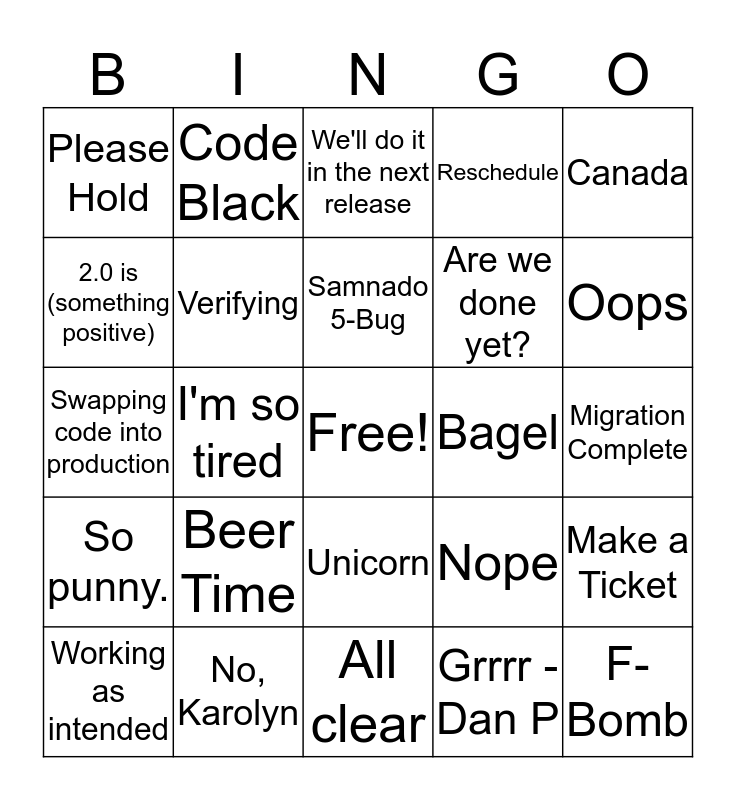 This bingo card has a free space and 24 words: Beer Time, No, Karolyn, Samnado 5-Bug, Working as intended, Canada, Please Hold, 2.0 is (something positive), Code Black, Bagel, Unicorn, Are we done yet?, Swapping code into production, Nope, Make a Ticket, Verifying, Grrrr - Dan P, Migration Complete, We'll do it in the next release, Oops, I'm so tired, F-Bomb, So punny., Reschedule and All clear.