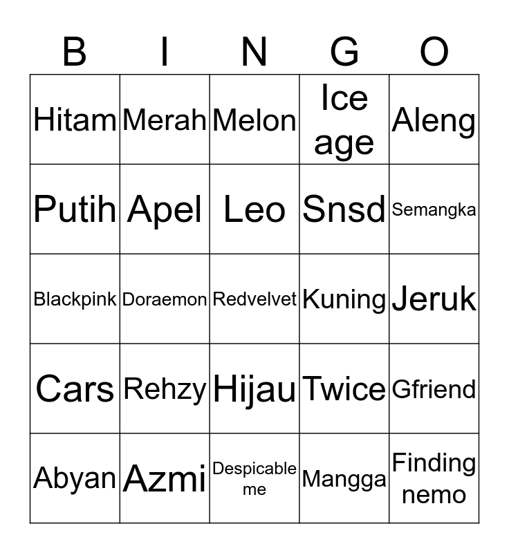 This bingo card has a free space and 24 words: Rehzy, Azmi, Leo, Abyan, Aleng, Hitam, Putih, Merah, Kuning, Hijau, Snsd, Blackpink, Twice, Gfriend, Apel, Mangga, Jeruk, Melon, Semangka, Doraemon, Finding nemo, Cars, Ice age and Despicable me.