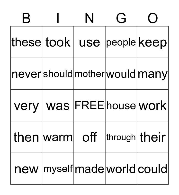 This bingo card has a free space and 24 words: warm, myself, mother, new, keep, these, never, took, house, off, would, very, through, their, should, world, work, use, many, was, could, then, people and made.