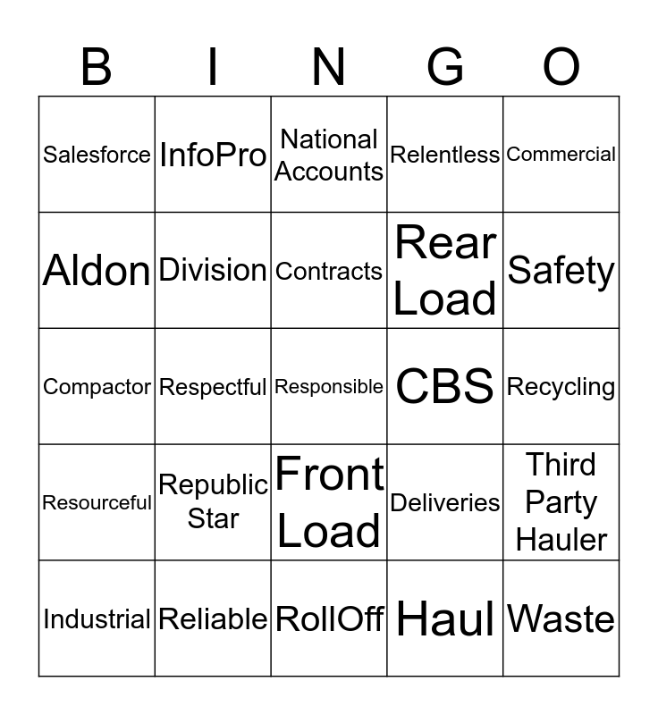 This bingo card has 25 words: Republic Star, RollOff, Contracts, Industrial, Commercial, Salesforce, Aldon, InfoPro, CBS, Front Load, Rear Load, Compactor, Deliveries, Third Party Hauler, Division, Waste, Recycling, National Accounts, Safety, Respectful, Responsible, Reliable, Resourceful, Relentless and Haul.