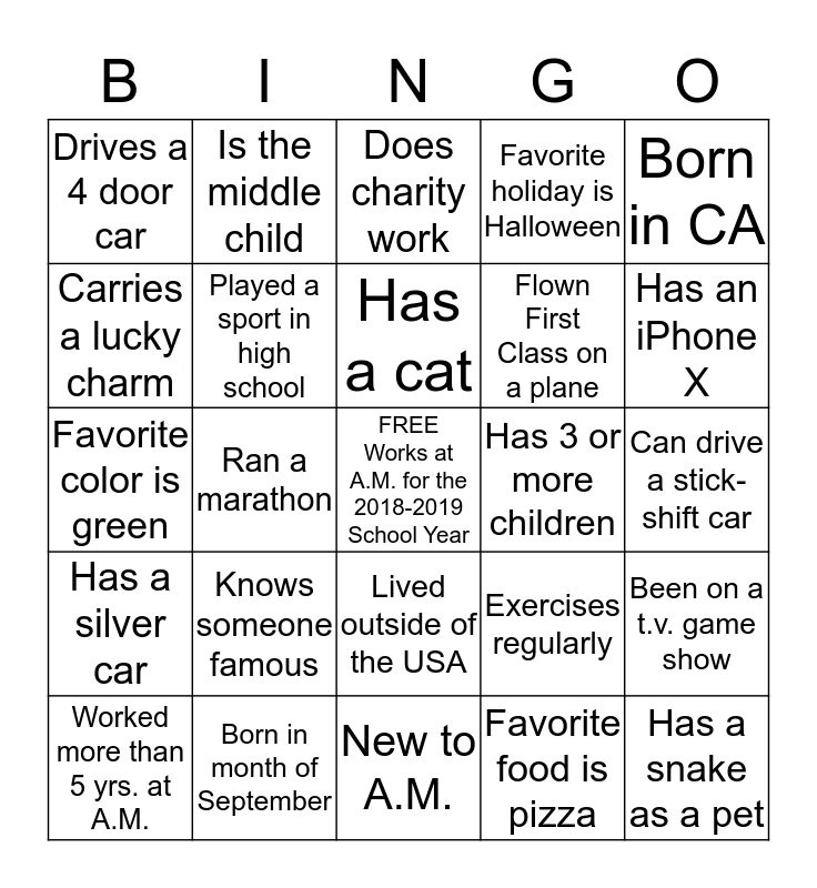 This bingo card has a free space and 24 words: Knows someone famous, Born in month of September, Has a cat, Worked more than 5 yrs. at A.M., Born in CA, Drives a 4 door car, Carries a lucky charm, Is the middle child, Has 3 or more children, Lived outside of the USA, Flown First Class on a plane, Favorite color is green, Exercises regularly, Been on a t.v. game show, Played a sport in high school, Favorite food is pizza, Can drive a stick-shift car, Does charity work, Has an iPhone X, Ran a marathon, Has a snake as a pet, Has a silver car, Favorite holiday is Halloween and New to A.M..