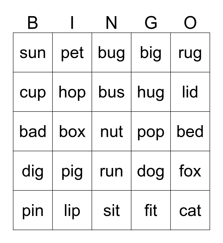 This bingo card has 25 words: pig, sit, bus, pin, rug, sun, cup, pet, pop, run, hug, bad, dog, fox, hop, cat, bed, bug, lid, box, nut, lip, dig, big and fit.