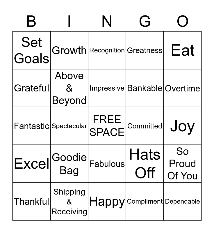 This bingo card has a free space and 150 words: 1st Shift, Accountability, Amazing Job, Audit Scores, Best In Class, 2nd Shift, Achievement, Applause, Awesome, Bravo, 3rd Shift, Administration, Bankable, Can Do Attitude, Above & Beyond, Advancement, Appreciative, Believe in Your Ability, Candy Jar, Accomplished, All Star, Attention To Detail, Beneficial, Capable, Celebrate, Champion, Commendation, Committed, Communication, Community, Compliment, Continually Improve, Credit, Crew, Customer Service, Dance, Dedication, Deliver, Dependable, Designing, Development, Dignity, Eat, Empowerment, Encouraging, Engineering & Tooling, Enthusiastic, Excellence, Excel, Exceptional, Extraordinary, Fabulous, Fantastic, Finance & Accounting, Focused, Food, Fun, Games & Prizes, Friendly, Give 100%, Global Expansion, Gold Star, Going Places, Goodie Bag, Grateful, Gratitude, Great Job, Greatness, Growth, Guess How Many, Hands On, Happy, Hats Off, Health & Safety, Helpful, High Five, Honesty, Hooray, H.R. (Human Resources), Hungry, Impressive, Incredible, Innovative, Integrity, I.T. (Information Technology), Job Well Done, Joy, Keep Up The Good Work, Kudos, Laser Cutting, Leadership, Magnificent, Maintenance, Making Lemonade, Manager, Manufacturing, Many Thanks, Marvelous, Much Improved, Never Give Up, On Time, Operations, Opportunities, Optimistic, Organized, Overtime, Partnership, Pat On The Back, Persevere, Phenomenal, Positive Behavior & Impact, Proactive, Production, Professional & Courteous, Programming, Punctual, Purchasing, Push Yourself, Quality Control, Recognition, Remarkable, Respectable, Responsible, Sales, Sensational, Set Goals, Shipping & Receiving, Smart, So Proud Of You, Spectacular, Stamping, Stupendous, Successful, Superb, Supervisor, Supportive, Team Players, Teamwork, Test & Analysis, Thankful, Thank You, Thumbs Up, Valuable, Visionary, Way To Go, Welding, Wonderful, Worthy, You Rock, You're On Your Way, You're The Best and Zero Defects.