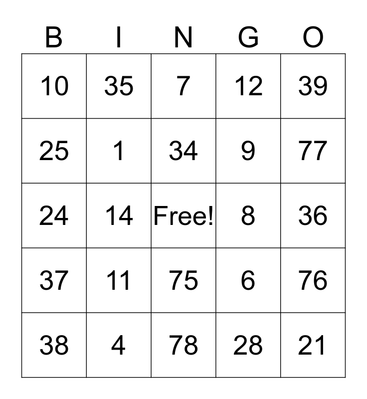 This bingo card has a free space and 24 words: 11, 4, 34, 38, 39, 10, 25, 35, 8, 75, 9, 24, 6, 76, 1, 28, 36, 7, 77, 14, 21, 37, 12 and 78.