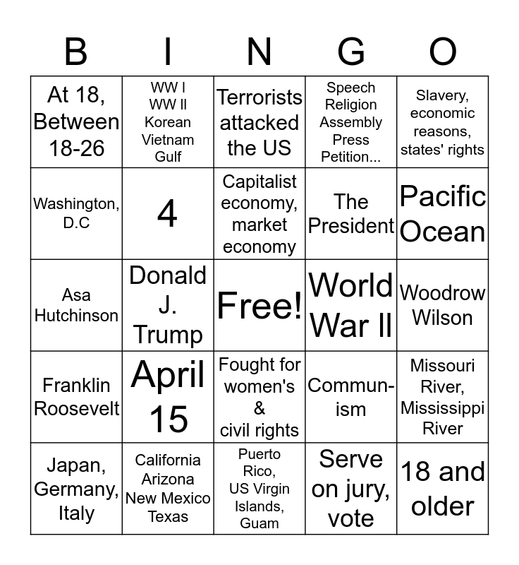This bingo card has a free space and 24 words: April 15, California Arizona New Mexico Texas, Capitalist economy, market economy, Japan, Germany, Italy, Slavery, economic reasons, states' rights, At 18, Between 18-26, Washington, D.C, WW l WW ll Korean Vietnam Gulf, World War ll, Fought for women's & civil rights, The President, Asa Hutchinson, Commun-ism, Missouri River, Mississippi River, 4, Serve on jury, vote, Woodrow Wilson, Terrorists attacked the US, Pacific Ocean, Donald J. Trump, 18 and older, Franklin Roosevelt, Speech Religion Assembly Press Petition... and Puerto Rico, US Virgin Islands, Guam.