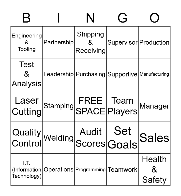 This bingo card has a free space and 24 words: Welding, Operations, Purchasing, I.T. (Information Technology), Production, Engineering & Tooling, Test & Analysis, Partnership, Team Players, Audit Scores, Supportive, Laser Cutting, Set Goals, Sales, Leadership, Teamwork, Manager, Shipping & Receiving, Manufacturing, Stamping, Health & Safety, Quality Control, Supervisor and Programming.