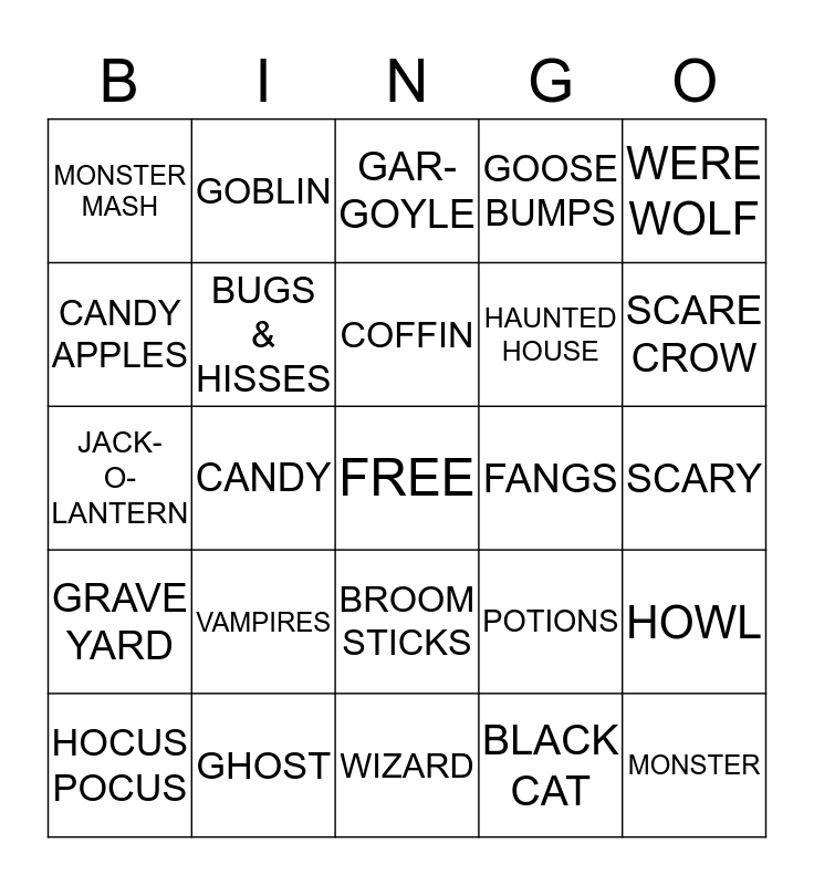 This bingo card has a free space and 24 words: VAMPIRES, GHOST, COFFIN, HOCUS POCUS, WERE WOLF, MONSTER MASH, CANDY APPLES, GOBLIN, FANGS, BROOM STICKS, HAUNTED HOUSE, JACK- O- LANTERN, POTIONS, HOWL, BUGS & HISSES, BLACK CAT, SCARY, GAR- GOYLE, SCARE CROW, CANDY, MONSTER, GRAVE YARD, GOOSE BUMPS and WIZARD.