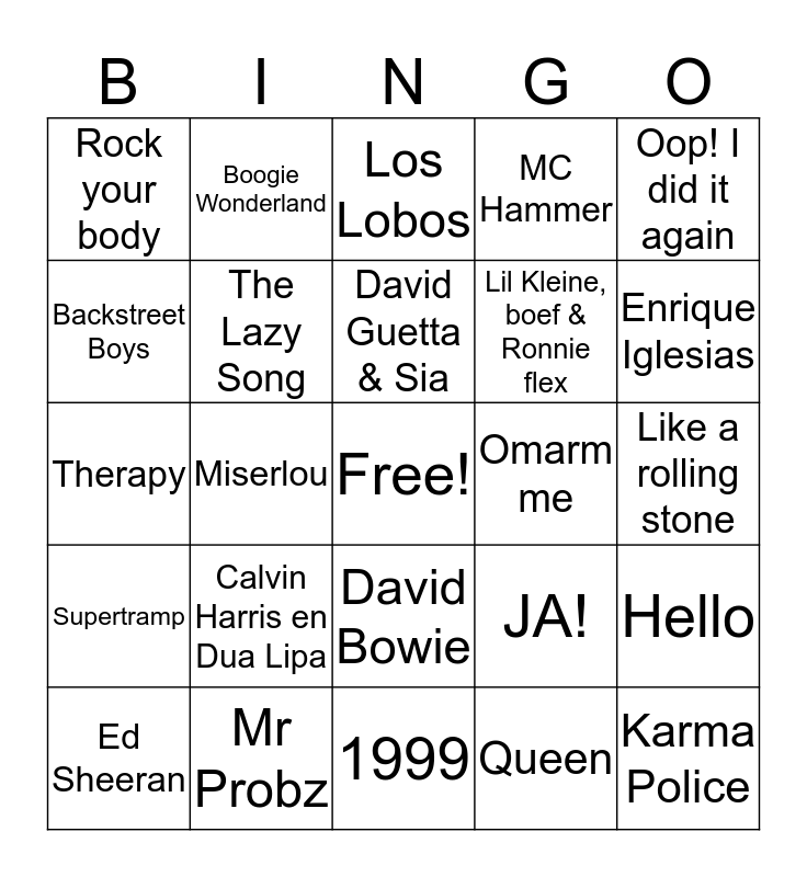 This bingo card has a free space and 24 words: Calvin Harris en Dua Lipa, Mr Probz, David Guetta & Sia, Ed Sheeran, Oop! I did it again, Rock your body, Backstreet Boys, Boogie Wonderland, Omarm me, David Bowie, Lil Kleine, boef & Ronnie flex, Therapy, JA!, Hello, The Lazy Song, Queen, Like a rolling stone, Los Lobos, Enrique Iglesias, Miserlou, Karma Police, Supertramp, MC Hammer and 1999.