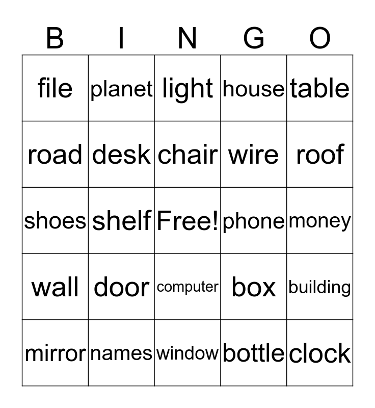 This bingo card has a free space and 35 words: cup, glass, paper, desk, computer, house, road, car, chair, plane, shoes, table, pen, book, file, phone, bottle, shelf, wall, clock, box, mirror, building, names, light, roof, shop, bag, wire, money, coins, window, door, planet and camera.