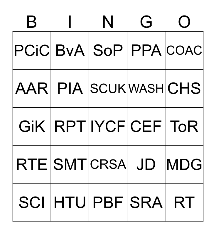 This bingo card has a free space and 24 words: SMT, HTU, SCUK, SCI, COAC, PCiC, AAR, BvA, CEF, CRSA, WASH, GiK, JD, MDG, PIA, SRA, ToR, SoP, CHS, RPT, RT, RTE, PPA and PBF.