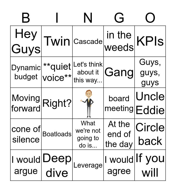 This bingo card has a free space and 24 words: Boatloads, Deep dive, Let's think about it this way..., I would argue, KPIs, Hey Guys, Dynamic budget, Twin, board meeting, What we're not going to do is..., Gang, Moving forward, At the end of the day, Circle back, **quiet voice**, I would agree, Uncle Eddie, Cascade, Guys, guys, guys, Right?, If you will, cone of silence, in the weeds and Leverage.