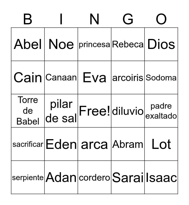 This bingo card has a free space and 24 words: Eden, Adan, Eva, serpiente, Dios, Abel, Cain, Noe, diluvio, arca, arcoiris, Torre de Babel, Abram, Lot, Canaan, Sarai, padre exaltado, princesa, Sodoma, pilar de sal, Isaac, sacrificar, Rebeca and cordero.