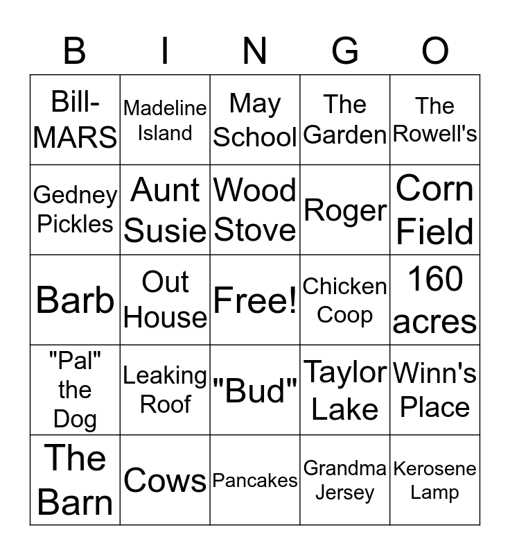 This bingo card has a free space and 24 words: Leaking Roof, Cows, Wood Stove, The Barn, The Rowell's, Bill-MARS, Gedney Pickles, Madeline Island, Chicken Coop, "Bud", Roger, Barb, Taylor Lake, Winn's Place, Aunt Susie, Grandma Jersey, 160 acres, May School, Corn Field, Out House, Kerosene Lamp, "Pal" the Dog, The Garden and Pancakes.